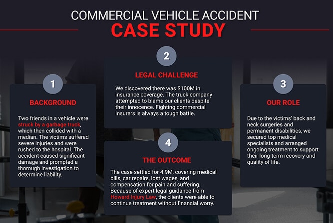 Two victims were seriously injured when struck by a garbage truck. The trucking company disputed fault, but our investigation uncovered significant commercial coverage and established liability. The case resolved for $4.9 million, providing compensation for surgeries, permanent injuries, and long-term care.