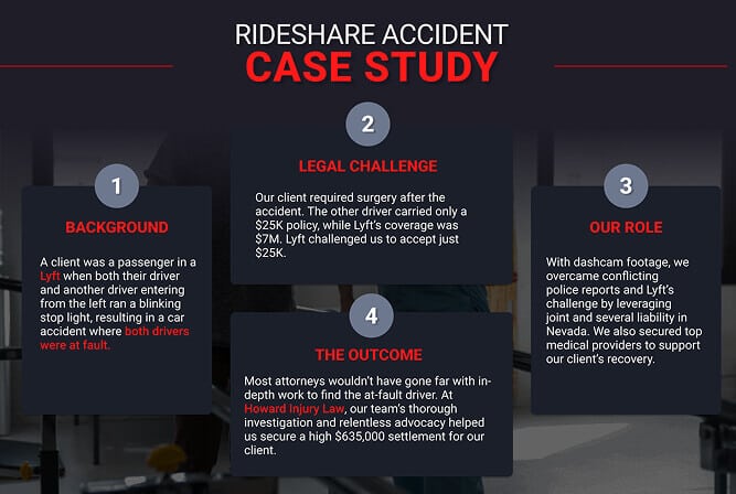 A Lyft passenger required surgery after a crash involving two negligent drivers. Although the other driver carried only a $25,000 policy, Lyft’s commercial policy provided significantly higher coverage. Using dashcam footage and Nevada’s joint and several liability laws, we overcame conflicting reports and insurer resistance.